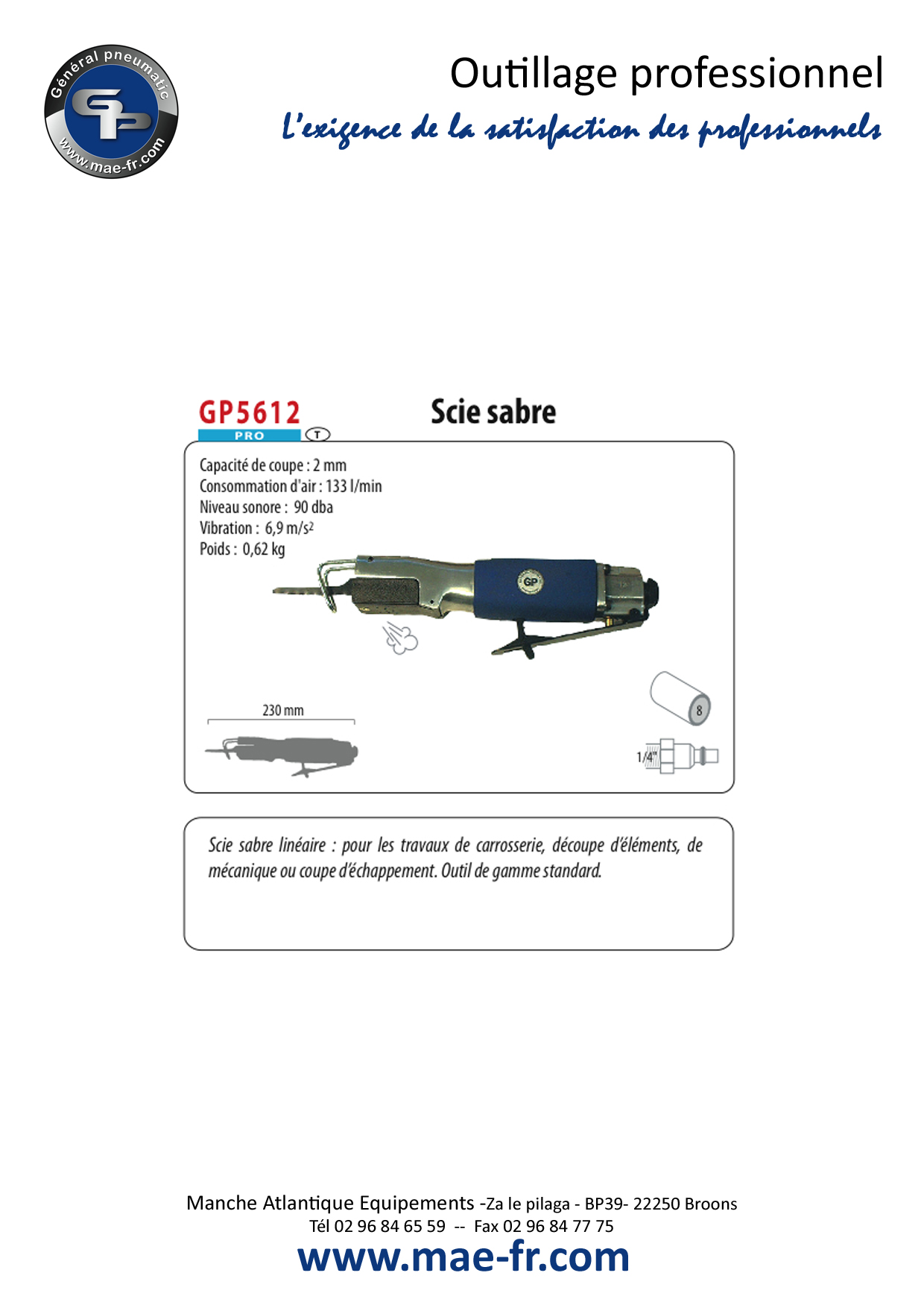 La scie sabre linéaire GP5612 de la marque MAE est pneumatique. Sa consommation d'air est de 133 litres par minute. Vous pourrez la raccorder à un compresseur d'air grâce à un embout 1/4" et à un tuyau de 8mm de diamètre.
