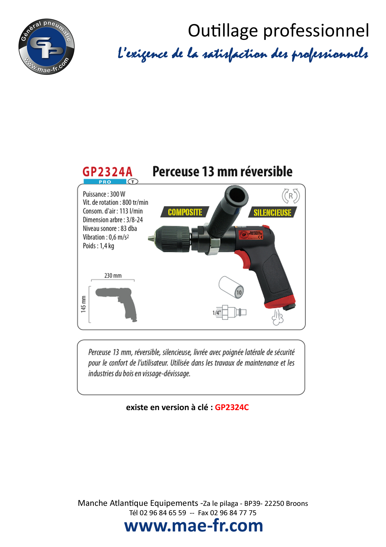 La perceuse réversible de la marque MAE a une puissance de 300W. Sa capacité de mandrin est de 13mm.